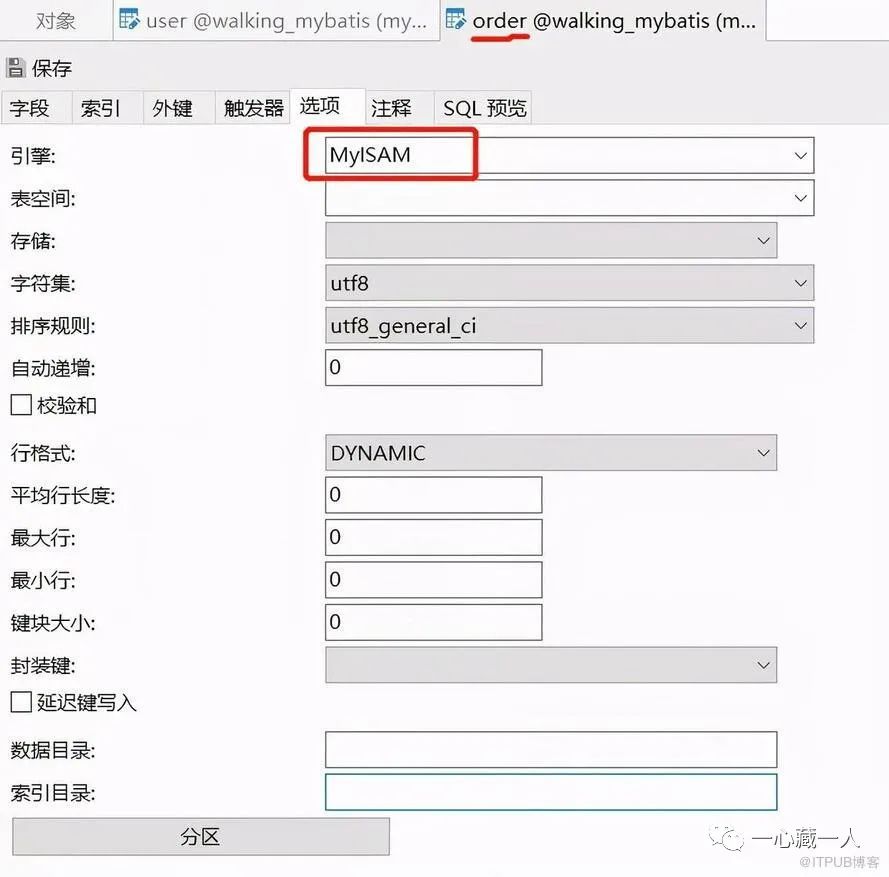 我这边又新建一个order表,然后选择为MYISAM存储引擎