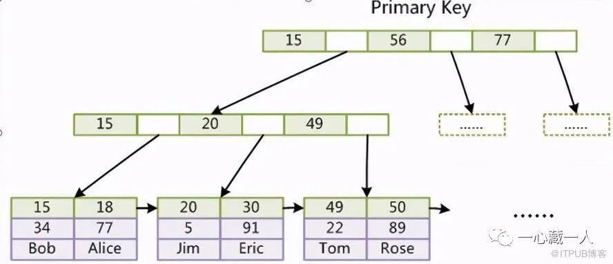 InnoDB存储引擎索引存储结构大概是下图这样的,它也是一个B+Tree,但是它的叶子节点和MYISAM有点区别,它存储的是索引所在行的所有字段。