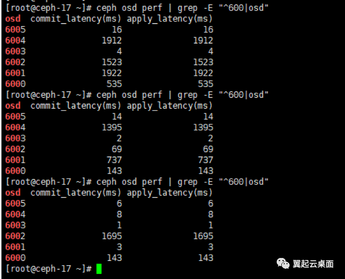 通过“ceph osd perf”命令可以看到纯ssd池osd会出现秒级别的commit_latency(这里显示的apply_latency和commit_latency都对应bluestore的commit延迟)。