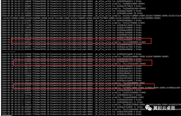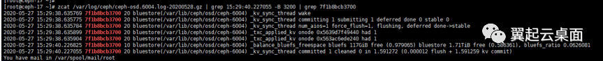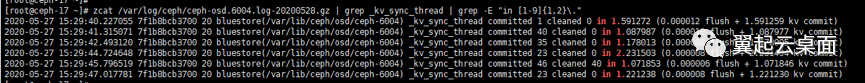 通过查看代码,kv延迟、commit延迟和submit延迟只有kv延迟会在日志中打印,因此可以从kv延迟开始排查。通过“ceph daemon osd.6004 config set debug_bluestore 20/20”调高日志等级,获取更多日志信息。