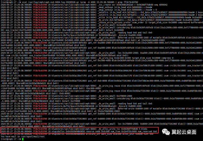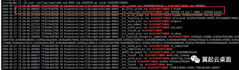 用正则表达式,抽取txc,然后在日志中查找_txc_create和_txc_committed_kv间隔较大的txc。然后根据txc抽取日志,可以发现0x5639df75db80 txc 从_do_alloc_write到_txc_calc_cost就已经出现1.6秒左右的延迟。