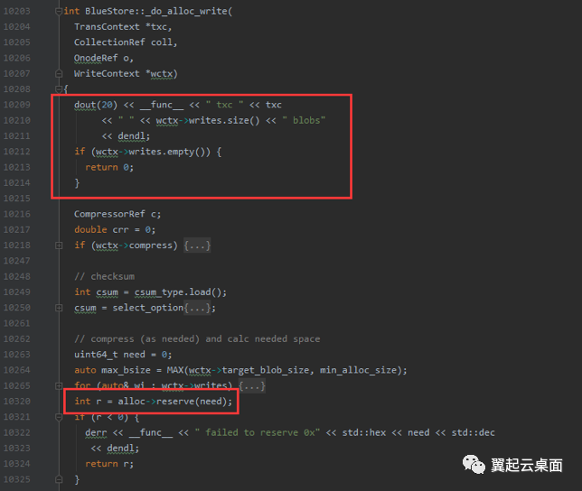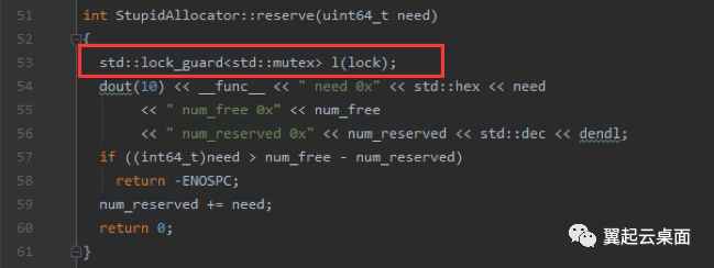 stupidalloc日志由_do_alloc_write调用alloc->reserve预留空间时打印,由于我们的环境没有开启压缩bluestore压缩,中间的代码可以忽略。在打印stupidalloc日志之前唯一可能造成延迟的地方就是获取分配器锁。