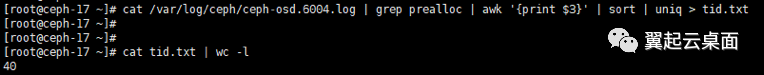 cat var/log/ceph/ceph-osd.6004.log | grep prealloc | awk ‘{print $3}’ | sort | uniq > tid.txt