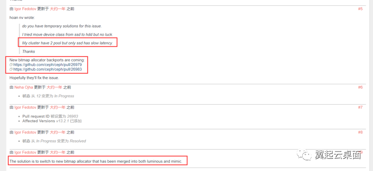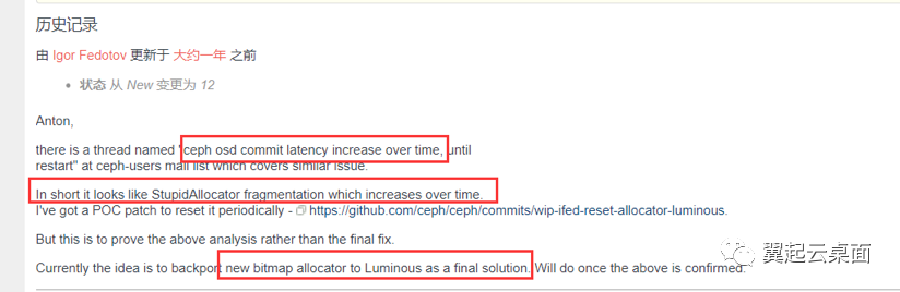 在ceph tracker里可以找到关于在SSD上创建bluestore OSD出现的大延迟问题,分析原因是由于stupid分配器在碎片多的时候效率会很低,SSD默认的最小分配空间是16K,HDD是64K所以SSD的碎片问题比较严重。新的bitmap分配器性能更佳且解决了这个问题。Luminous 12.2.12版本移植了master分支的新bitmap分配器,Luminous 12.2.13版本将默认的分配器修改为bitmap。