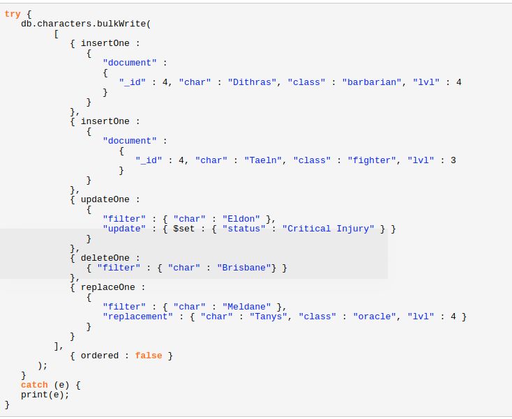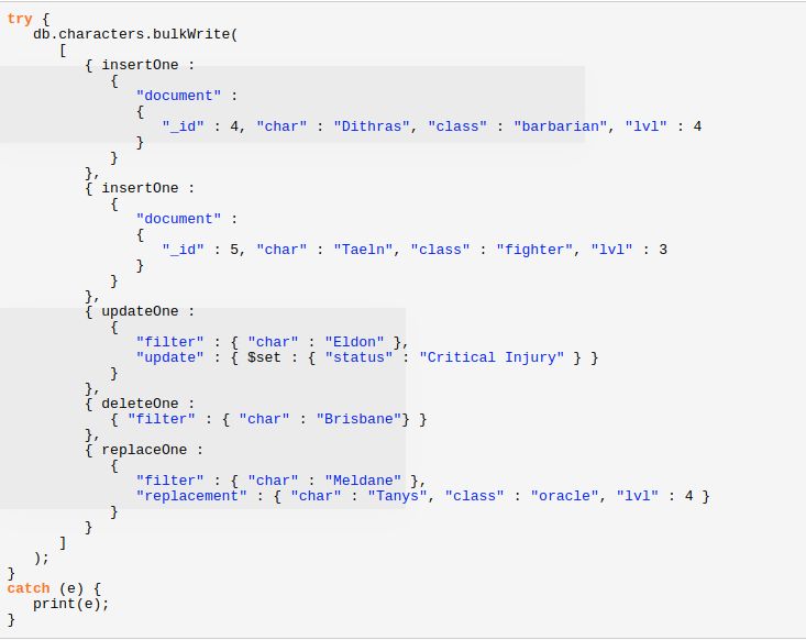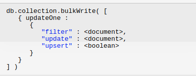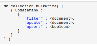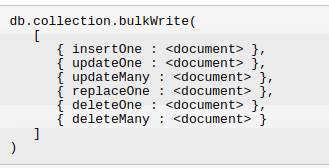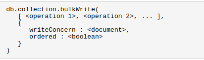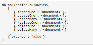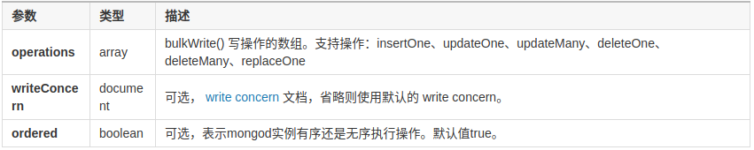 bulkWrite() 接收一个写操作的数组然后执行它们中的每一个。默认是有序的执行。