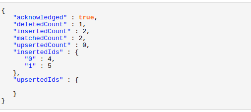 操作基于 write concern 运行则 acknowledged 值为true,如果禁用 write concern 运行则 acknowledged 值为false。