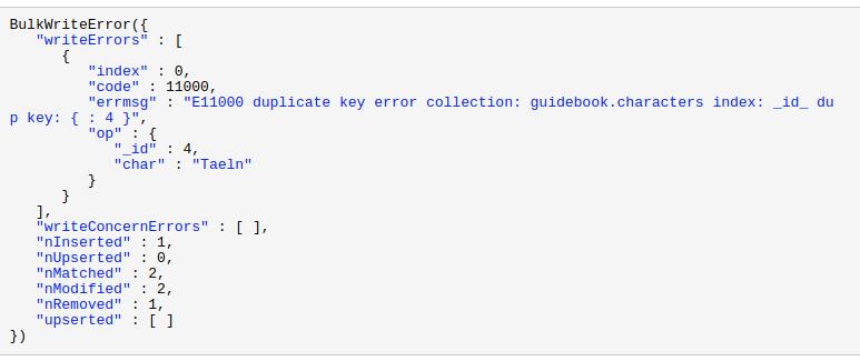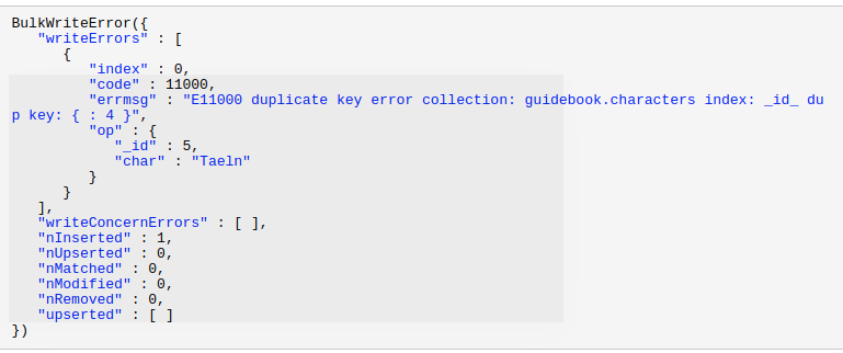 如果 第二个 insertOne 操作的 _id 是集合中已经存在的,则会抛出以下错误: