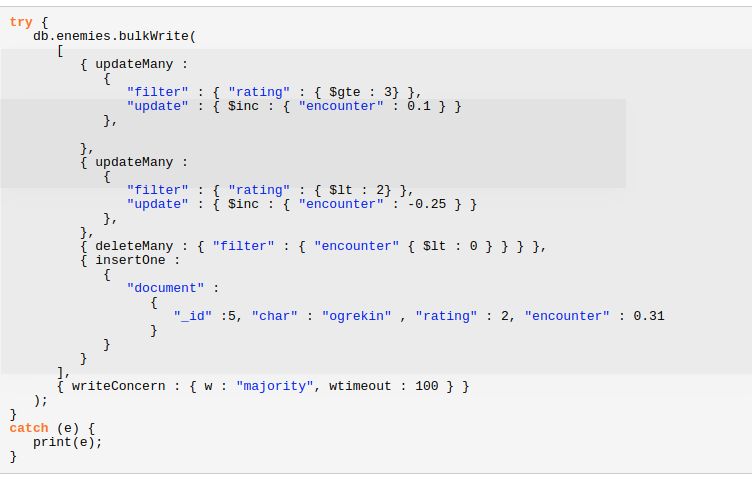 以下使用 write concern 值为 "majority" 及 timeout 为 100 毫秒来执行批量写操作:
