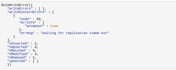 如果副本集中所有必需节点确认写入操作所需的总时间大于wtimeout,则在wtimeout 时间过去时将显示以下writeConcernError。