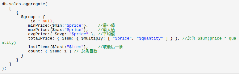 • _id 字段是必须要的,如果不指定字段进行分组则用 null,表示不分组的统计;