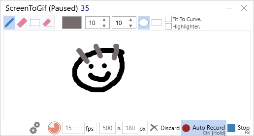 画板录像机可以自动截取你绘画的过程。通过它,你可以在ScreenToGif提供的画板类进行想法的表达并得以记录下来。你可以在界面的底部开启自动捕捉,或按住Ctrl切换(暂停或捕捉动画,取决于自动捕捉是否开启),选择录制的最大帧率。同样,你也可以通过缩放窗口以调整录制区域尺寸大小。