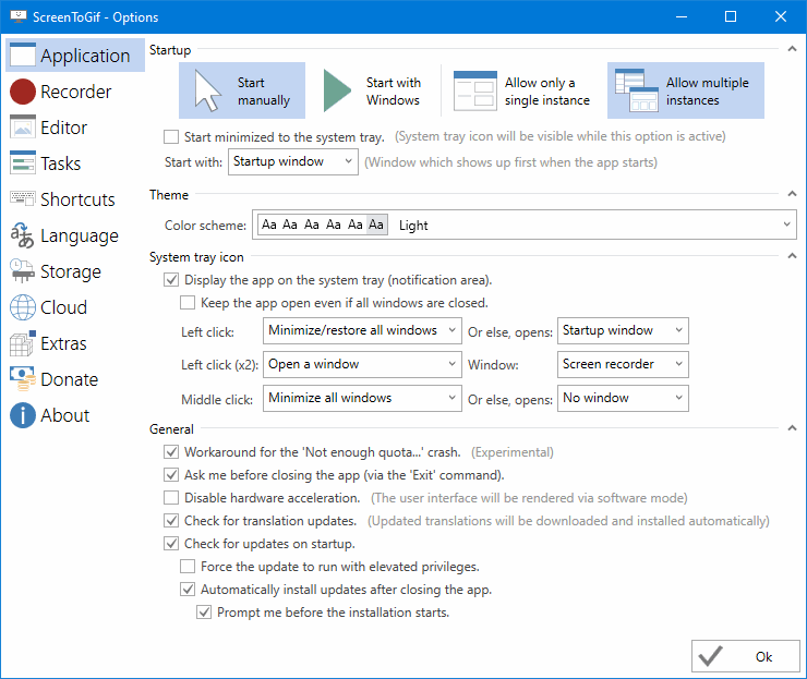 选择程序启动方式。 4种配色方案(亮色到暗色)。 改变系统托盘图标互动方式(点击打开程序的某一部分)。 决定程序是否自动更新(翻译更新可以单独选择)。