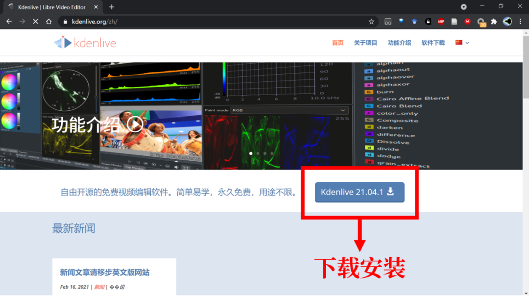 进入kdenlive.org站点首页,点击下载安装包,点击后按照提示设置即可,十分方便!