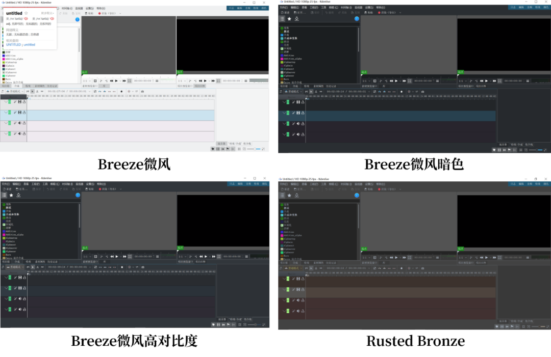 Kdenlive界面不觉非常清晰,对用户操作具有较强的提示性。同时在界面美观性上,Kdenlive的设计师也为用户提供了不同的主题方案。你可以通过设置->颜色主题