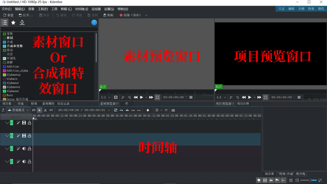 来进行选择和设置。当前支持的颜色主题包括:Kdenlive主要包含如下几个窗口:素材窗口、预览窗口、时间轴、合成和特效窗口等。