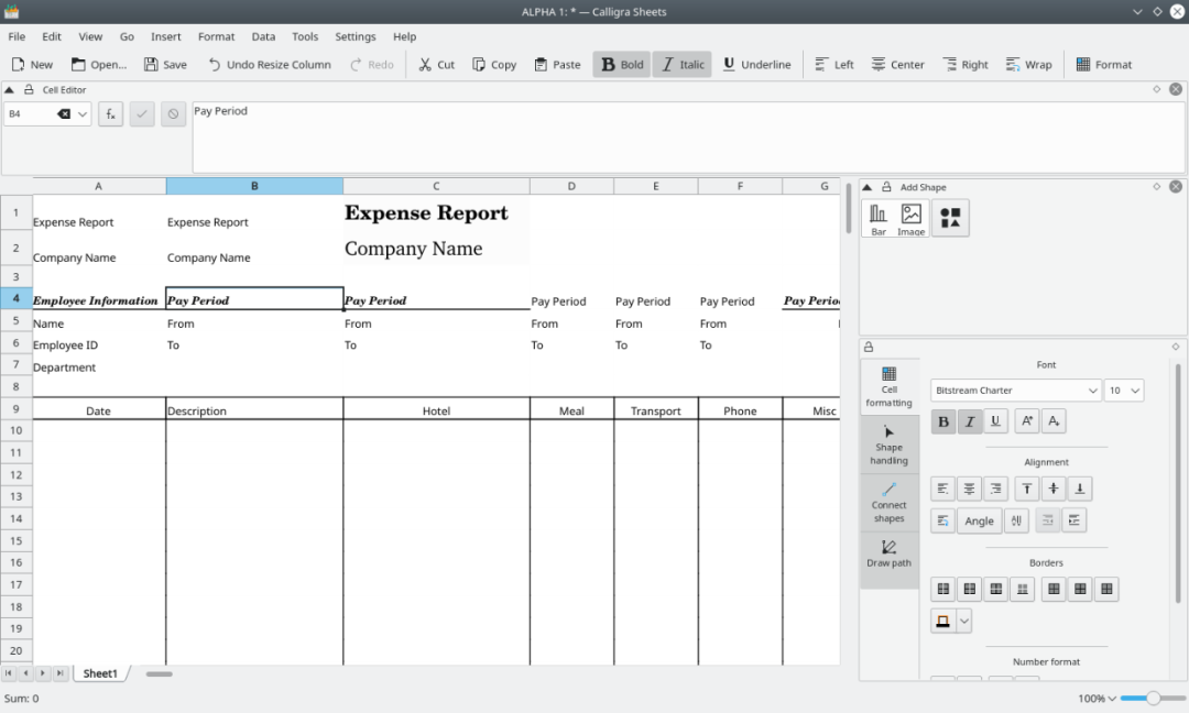 Calligra Sheets是一个功能齐全的电子表格应用程序。使用它可以快速创建带有公式和图表的电子表格,以计算和组织数据。使用它你可以完成部分Microsoft Excel的工作。