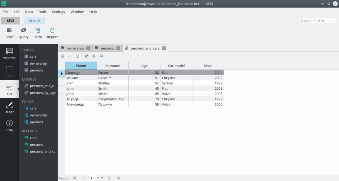 KEXI是一个可视化数据库应用程序生成器。它可以用于设计数据库应用程序、插入和编辑数据、执行查询和处理数据。可以创建表单来为数据提供自定义接口。所有数据库对象(表、查询、表单、报告)都存储在数据库中,这使得共享数据和设计变得很容易。使用它你可以完成部分Microsoft Access的工作。