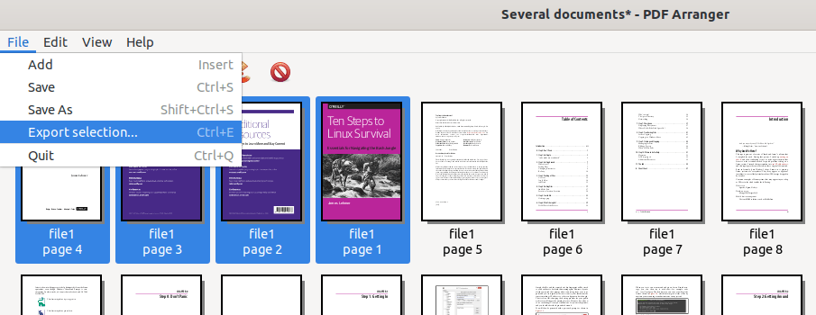 要合并特定的一组页面,只需选择它们并单击File ->Export selection 。在输出文件中输入名称并将其保存到你所选择的任何位置。