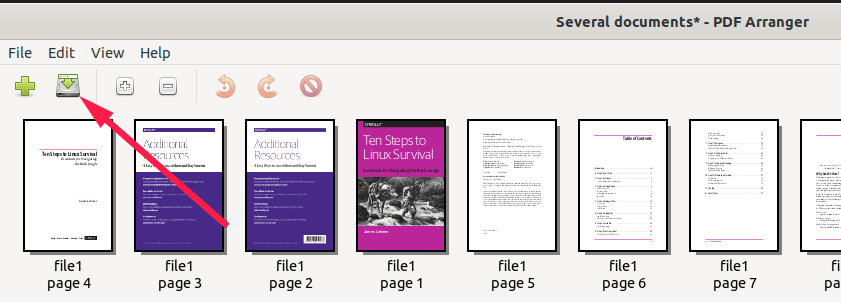 如您所见,PDF Arranger以PDF文件名的字母顺序对PDF文件进行排序。在我的示例中,它首先排列的是file1.pdf的页面。然后是file2 .pdf的页面。