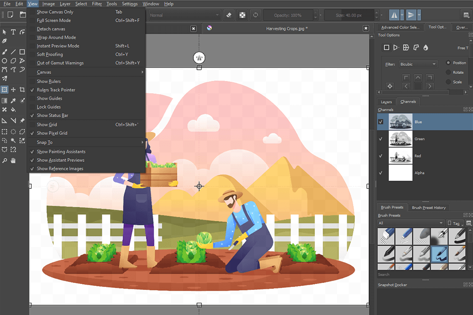 Krita是一个免费的绘图应用程序,既适合专业的设计工作者也适合业余的爱好者。它提供了一套完整的笔刷来执行各种任务,以及一系列的滤镜,包括用于设置透视图的绘图助手等。它提供了许多类型的笔刷,让你可以根据个人喜好进行使用。它们被设计用来执行特定的功能,并用来满足特定的需求。上一个软件版本宣称改进了对平板电脑、OpenGL扩展和“无限”画布的支持。该程序也支持RAW文件,但是相应的对RAW文件的编辑能力较弱。