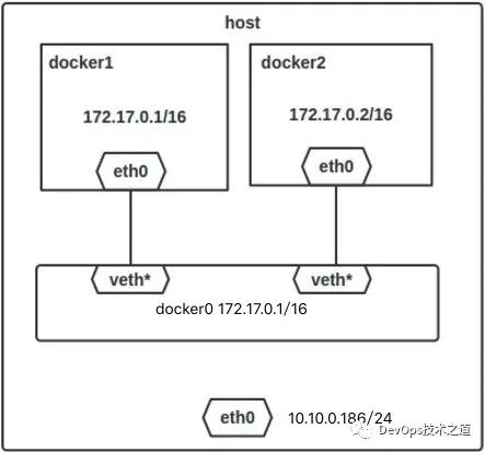 当Docker server启动时,会在主机上创建一个名为docker0的虚拟网桥,此主机上启动的Docker容器会连接到这个虚拟网桥上。虚拟网桥的工作方式和物理交换机类似,这样主机上的所有容器就通过交换机连在了一个二层网络中。接下来就要为容器分配IP了,Docker会从RFC1918所定义的私有IP网段中,选择一个和宿主机不同的IP地址和子网分配给docker0,连接到docker0的容器就从这个子网中选择一个未占用的IP使用。如一般Docker会使用172.17.0.0/16这个网段,并将172.17.0.1/16分配给docker0网桥(在主机上使用ifconfig命令是可以看到docker0的,可以认为它是网桥的管理接口,在宿主机上作为一块虚拟网卡使用)。单机环境下的网络拓扑如下,主机地址为10.10.0.186/24。