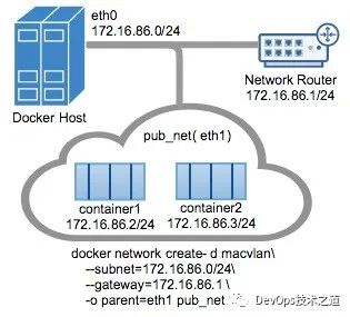 此示例中使用的父接口位于eth0子网上172.16.86.0/24,这些容器中的容器docker network也需要和父级同一个子网-o parent=。网关是网络上的外部路由器,不是任何ip伪装或任何其他本地代理。