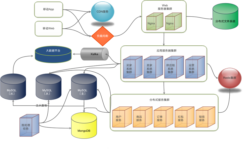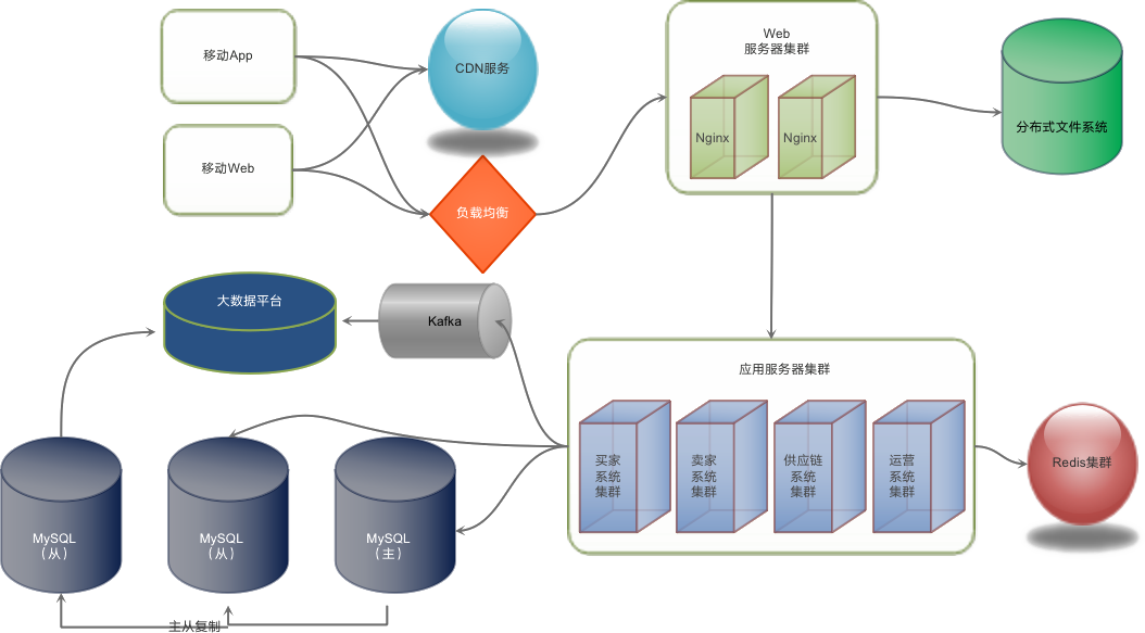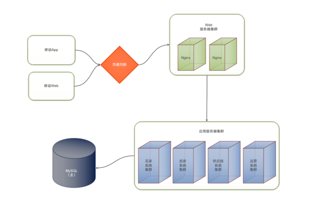 应用端主要是移动端的应用,通过负载均衡访问 Web 服务器集群,也就是前端集群 前端集群是两台 Nginx 服务器组成的,在 Nginx 再进行一次负载均衡,将用户请求分发到一组应用服务器集群 应用服务器集群按照应用场景分为买家系统、卖家系统、供应链系统以及运营系统四个系统集群,每个系统集群又包含了若干台服务器,所有这些系统都连接到一台 MySQL 服务器上