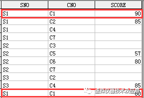 再同样,下面的选课表SC,包含SNO、CNO、SCORE三个属性,分别用于描述选课记录的学生号、课程号、成绩三个属性。其中学生的选课搭配(SNO,CNO)的取值都是独一无二的,它能唯一定位到(标识)一个具体的选课记录,因此属性SNO和CNO的组合(SNO,CNO)为选课表SC的主键。
