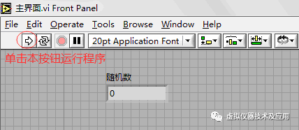 本程序包含三个文件:登录.vi、主界面.vi和全局变量.vi。运行方法为:(1)打开文件“主界面.vi”,点击“运行”按钮,如下图所示: