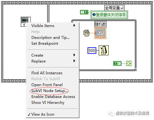 ②在“主界面.vi”的框图程序中,用鼠标右键点击子VI图标,在弹出的菜单中点击“SubVI Node Setup...”,如下图所示: