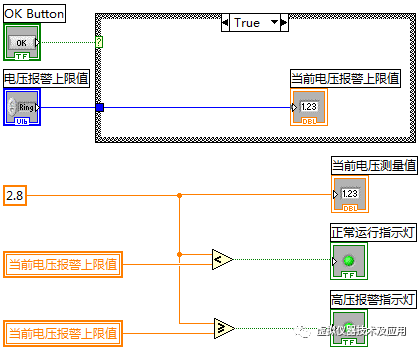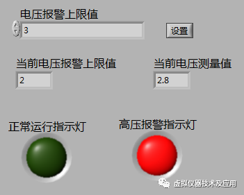 上周五实验课的时候,有个同学问我说,他觉得他设计的程序没有问题,但是运行不了。其设计的程序对应的题目为:设计如图1所示界面的程序,并实现功能:①通过“设置”按钮设置电压报警上限值;②当电压测量值大于报警上限值时点亮高压报警警示灯,否则点亮正常运行指示灯。