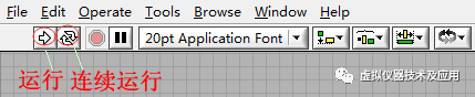 我看了一下框图程序,确认他的设计是正确的,然后我就跟他说,运行一下程序给我看看。当他运行时,我发现了问题所在,原来他运行程序使用的是“运行”按钮,以至程序没有展示出我上课时演示的效果,于是觉得程序设计有问题。我就跟他说,程序设计没有问题,但此道程序应该使用“连续运行”来运行。那么,问题来了,LabVIEW程序“运行”和“连续运行”有什么区别?什么时候使用“运行”?什么时候又要使用“连续运行”呢?我下面就对这几个问题进行讲解。