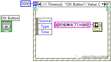 那么,对LabVIEW程序,什么时候使用“运行”?什么时候又要使用“连续运行”呢?大部分情况下,对LabVIEW程序应该选择“运行”,因为LabVIEW程序在实际中就是这样使用的。而“连续运行”一般用于需要观察参数改变时运行效果变化的情况,也可以认为“连续运行”为一种调试模式。如图2所示的程序只有使用“连续运行”才能观察到程序运行效果。还一个典型的需要使用“连续运行”的程序如图4所示。该程序实现的功能为:无论是单击了OK按钮还是定时5s时间到,都弹出一个对话框提示“超时或单击了OK按钮”。如果采取“运行”模式,则每一次运行只能看到一个效果,就是单击OK按钮或者定时时间到的效果。如果采取“连续运行”,则可以持续观察到单击OK按钮和定时时间到的效果。