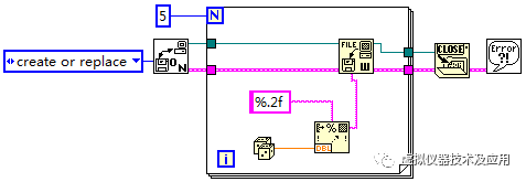 到这里,大家应该是了解了LabVIEW程序“运行”和“连续运行”的区别。但是有些同学可能会突发奇想:反正“连续运行”就是多次运行,这个没什么影响,那么就干脆只要需要运行LabVIEW程序,就采取“连续运行”。很明显,这个想法是错误的,在某些情况下还会给你带来麻烦,比如图5所示的程序。该程序实现的功能为:弹出一个对话框,用于用户建立1个文本文件,然后使用For循环将产生的5个随机数写进该文件。这个程序如果采用“连续运行”模式,将会持续不断跳出对话框让你选择文件,让你什么都干不了。最后你将不得不采取通过Ctrl+Alt+Del调出任务管理器结束LabVIEW软件运行的方式来解决这个麻烦。