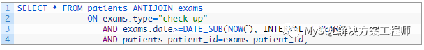 “First Match”策略:从patients那里读取记录,在exams找到匹配,如果没有匹配,则发出patients 记录;这等同于我们保留了子查询。