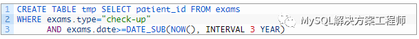 “Materialization”策略:观察ON子句中存在三个子条件,其中只有一个取决于patients。因此,MySQL可以自动构建一个临时表tmp,该表由与前两个子条件(type 和date)匹配的exams 记录构成;类似于下图: