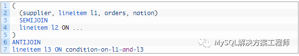 这是我们理解antijoin转换的另一个关键优势的地方:因为它的ON条件仅取决于l1和l3,因此只要保持其位置在l1之后,antijoin运算符就可以在FROM子句中的任何位置左右移动。最佳位置取决于l3中的记录数(此数字越大,评估计算反连接的成本就越高),并且取决于反连接条件的选择性。代价高昂的操作符应该推迟运行,可以使更多记录被之前的操作符删除;另一方面,如果该操作符非常有选择性,则应该尽早运行,以尽快消除大量的记录。因此,没有简单的答案,必须进行成本计算和比较。MySQL的基于成本的优化器将考虑访问表的不同顺序,并选择成本最低的表。
