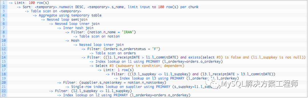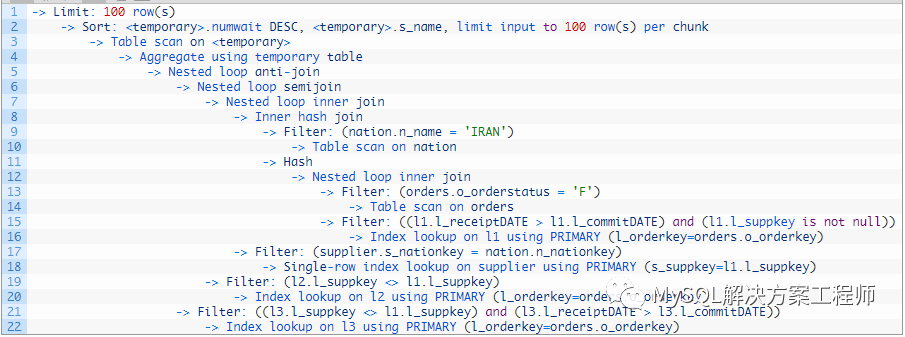 有一个明显的异议。有人可能会说:“不需要使用反联接运算符,MySQL可以保留子查询,而不合并它,并在最佳位置(在读取l1,orders或nation…之后)进行评估,按你说的做基于成本的选择”。
