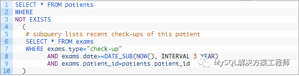 如果使用这种形式的查询,该语句的优化潜力非常小。我们必须读取patients表中的每条记录,并检查每条记录是否存在于子查询。我们需要对子查询进行多次评估计算,因为它的WHERE子句取决于patients.patient_id,它随patients的每条记录而变化(我们称为“相关子查询”)。