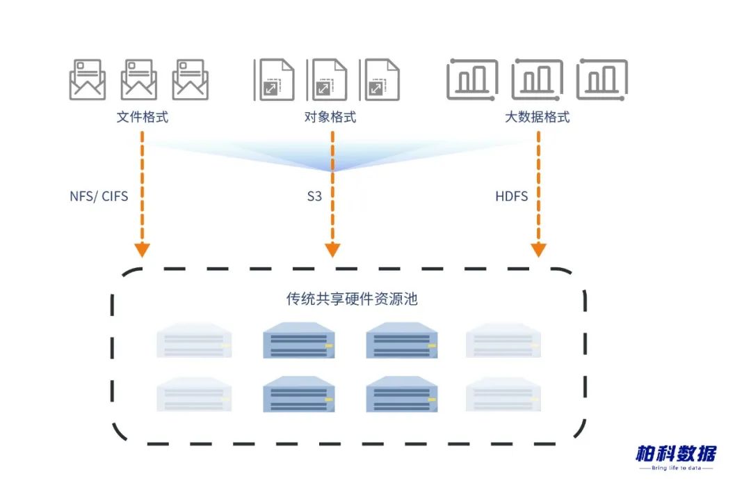 在整个数据处理闭环中,数据转换格式的时间占全过程的35%以上,如何提升多样性格式数据的处理效率,逐渐成为存储领域新型技术的主流趋势。传统存储厂商仍通过共享硬件资源池,在一套硬件集群上划分出多了独立的逻辑资源池,分别部署对象、块、文件系统的存储池,实现硬件集群多样化格式的共享存储。但在该资源池中,每一个逻辑资源池仅仅只会支持一种访问协议,对于跨协议访问时,仍需要先行拷贝原格式的原始数据,再将其进行数据格式转换,实现不同格式之间的数据相互转换及交互。