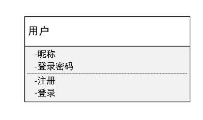 类就是我们前面分析得到角色,角色有属性和行为,因此在类图中也有属性和行为。在上面的类图模型中,用户是类(角色)的名称,昵称和登录密码是类的属性,注册和登录是类的行为。