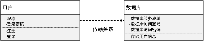 依赖关系是指在类的行为中使用到另一个类。例如用户类的注册行为,就会使用到数据库类来存储用户信息。图2-13是依赖关系的类图模型。