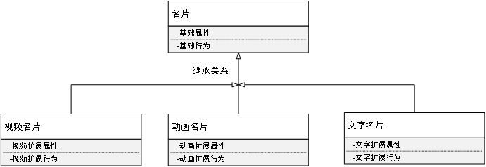 继承关系是指一个类继承另一个类的属性和行为,被继承的类称为父类,继承的类称为子类。继承的思想是把同类事物的共同属性抽取出来形成基类,基类可以被更具体化的子类来继承。例如,假如人脉系统要支持多种类型的名片,我们就可以把名片的共同属性和行为抽取出来形成基类,然后在基类的基础上,通过继承关系创建视频名片、动画名片、文字名片等不同媒体的名片。图2-14是继承关系的类图模型。
