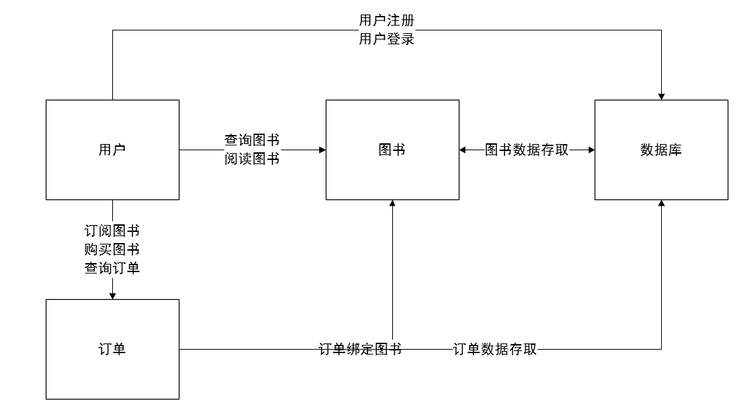 在图2-16业务关系图中,用户、图书、数据库和订单为发生业务关系的对象,也称为实体。用户和图书涉及“查询图书”和“阅读图书”两个业务,用户和订单涉及“订阅图书”、“购买图书”、“查询订单”三个业务。每个业务都涉及两个或多个实体。在建立业务模型时,要充分考虑到实体间的业务关系,将业务绑定到实体内作为实体内的方法,并不是一种好的建模方法。较为通用的建模方法是把实体单独作为一个类,该类仅包含实体的属性,将业务按照类别组合为一个或多个类,每个类完成相近的业务。