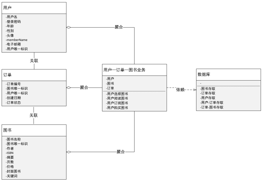 图2-17为用户、订单和图书业务模型。用户、订单和图书均为实体类,仅包含对象的属性。业务类为“用户—订单—图书业务”,在业务类聚合了用户、图书、订单实体对象,并提供了“用户选择图书”、“用户阅读图书”、“用户订阅图书”、“用户购买图书”业务方法,他们均依赖数据库类提供的实体类数据存取方法。