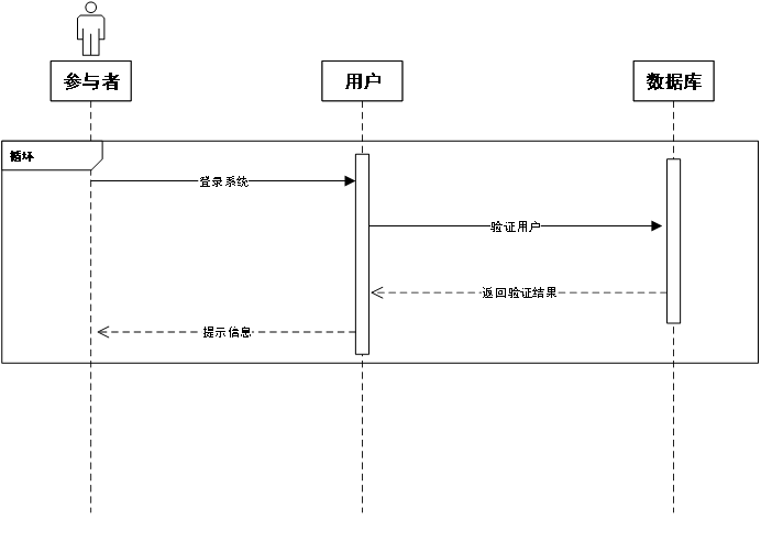 图2-20是用户登录顺序图。用户在登录系统的过程中,可能会输错账号或密码,系统允许用户重新输入账号或密码再次登录。因此用户的登录过程是一个循环流程,在顺序图用循环片段来表示。