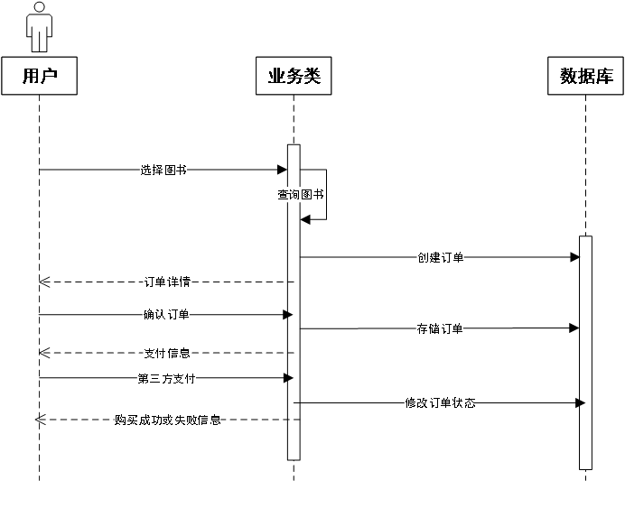 图2-21是用户购买图书顺序图。用户进入系统图书列表页面:①查询或直接选择图书;②提交图书购买请求到业务类,业务类创建订单,并返回订单详情让用户确定;③用户确认订单后,业务类存储订单数据到数据库,并返回支付信息;④用户使用第三方支付成功,第三方支付调用业务类的支付成功接口,业务类修改订单状态;⑤业务类返回购买成功或失败信息到用户。
