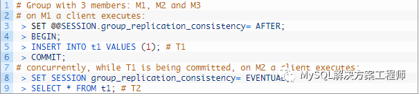 您只需要在这些指令上SET @@SESSION.group_replication_consistency= ‘BEFORE’ ,并使用EVENTUAL运行其他指令。