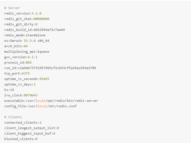 我们可以使用 INFO 命令来了解当前 Redis 数据库的基本状态,更多的命令请查阅参考链接中给出的地址,这里不赘述: