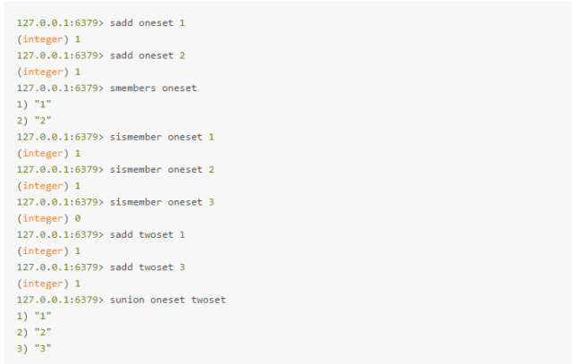 Redis 中的集合是无序集合,基本的操作对应于集合的操作,比方说添加、删除、交并差集等等,例如: